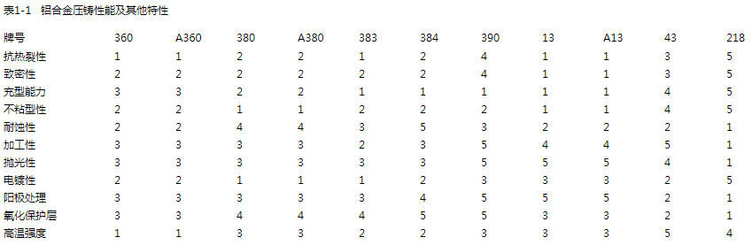 表1-1介紹了鋁合金壓鑄性能及特性,這個表有助于設(shè)計者在設(shè)計壓鑄產(chǎn)品時,了解所采用的壓鑄合金特性能否滿足產(chǎn)品要求。掌握了某種合金的特性后,在制定壓鑄工藝、模具設(shè)計、后加工及表面處理時可采取相適應的措施,來保證產(chǎn)品的質(zhì)量。